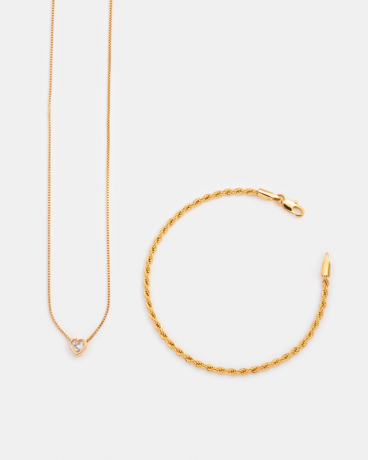 Combo Cadena Corazón Cristal + Pulsera Lazo en Oro laminado 18k para Dama