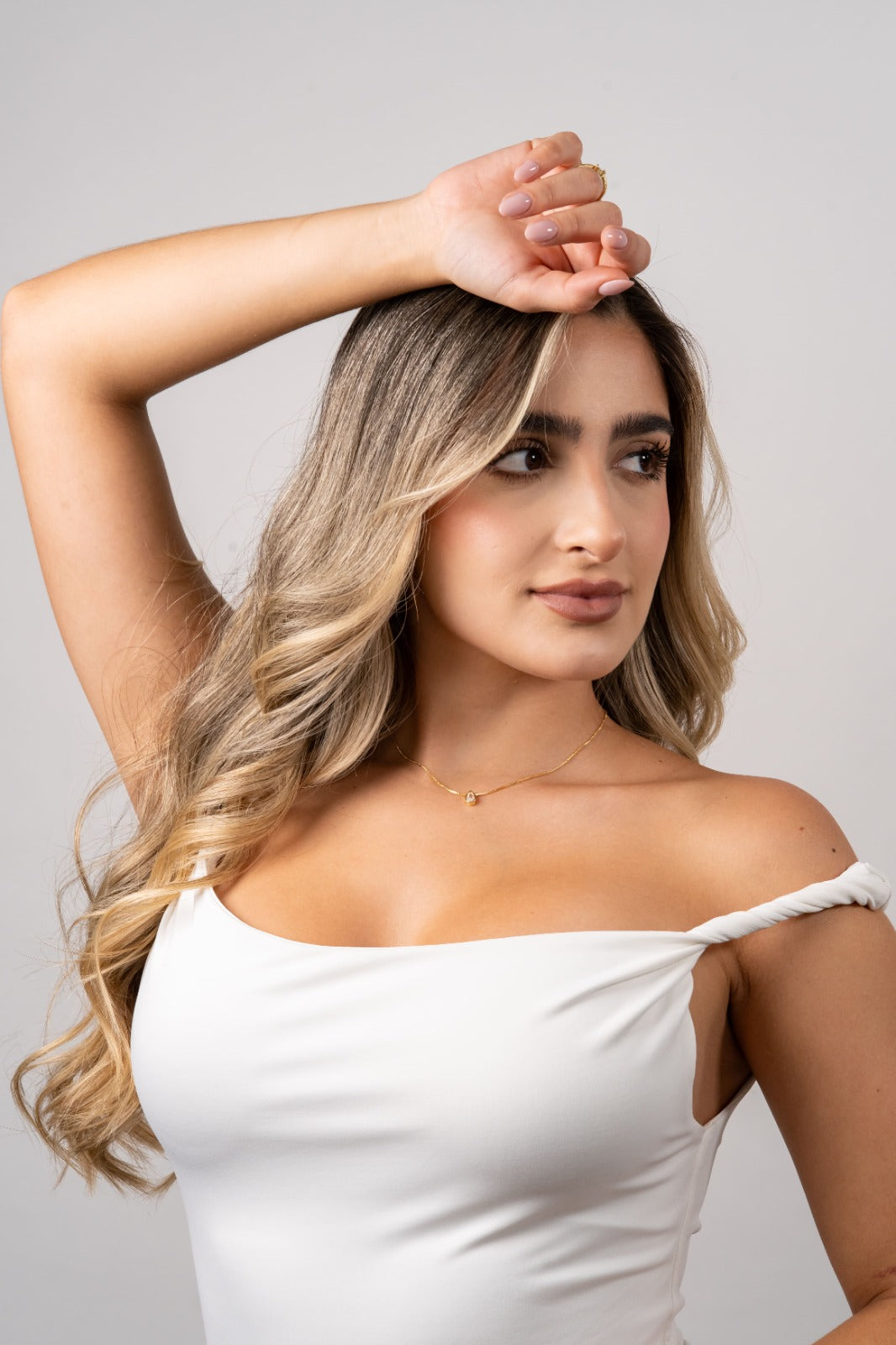 La Cadena Lágrima es una joya que guarda sentimientos, recuerdos y sueños. Su piedra en corte lágrima simboliza sensibilidad y fuerza, como una caricia de luz que reposa en tu cuello, brillando con cada movimiento.