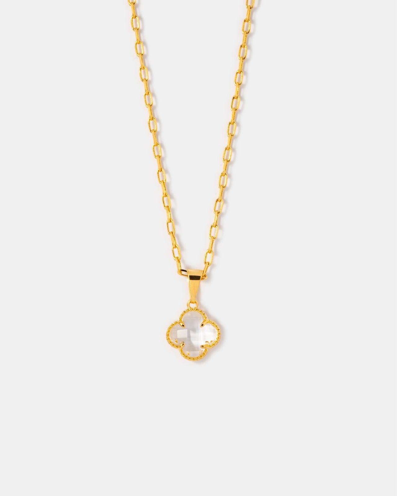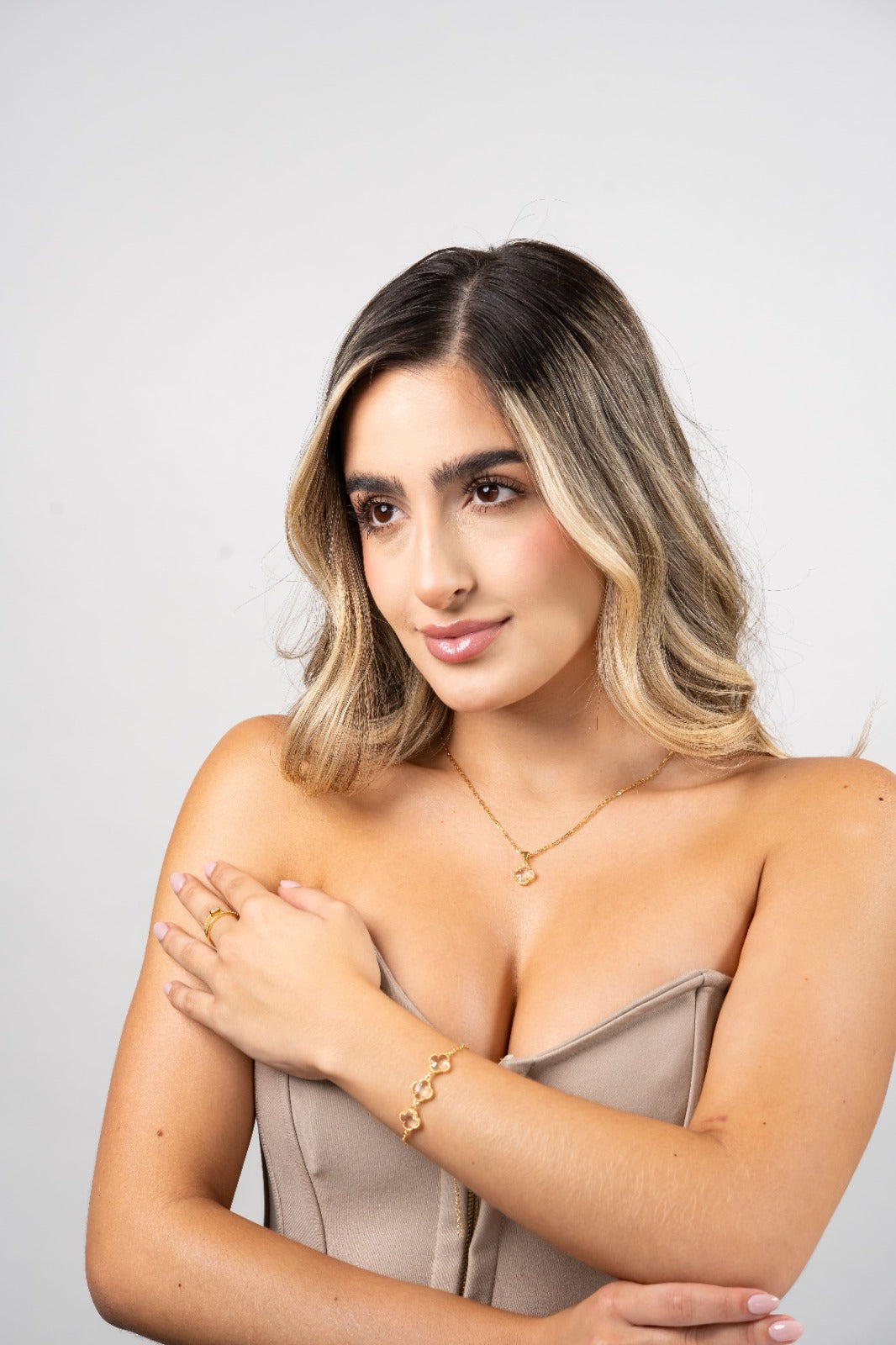 La Cadena Klaver Lumi en Oro Laminado 18k es una joya que refleja la pureza, la protección y la feminidad más luminosa. Su dije en forma de trébol en cristal claro representa claridad de mente, buenas energías y nuevas oportunidades. Una pieza diseñada para mujeres que eligen brillar desde adentro.