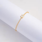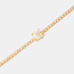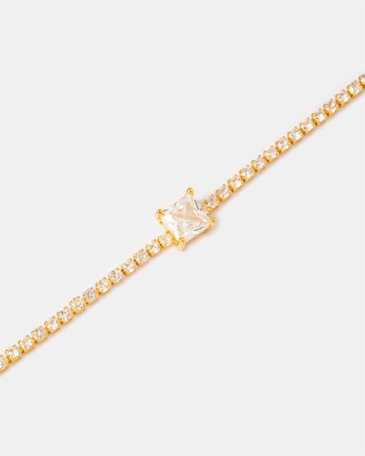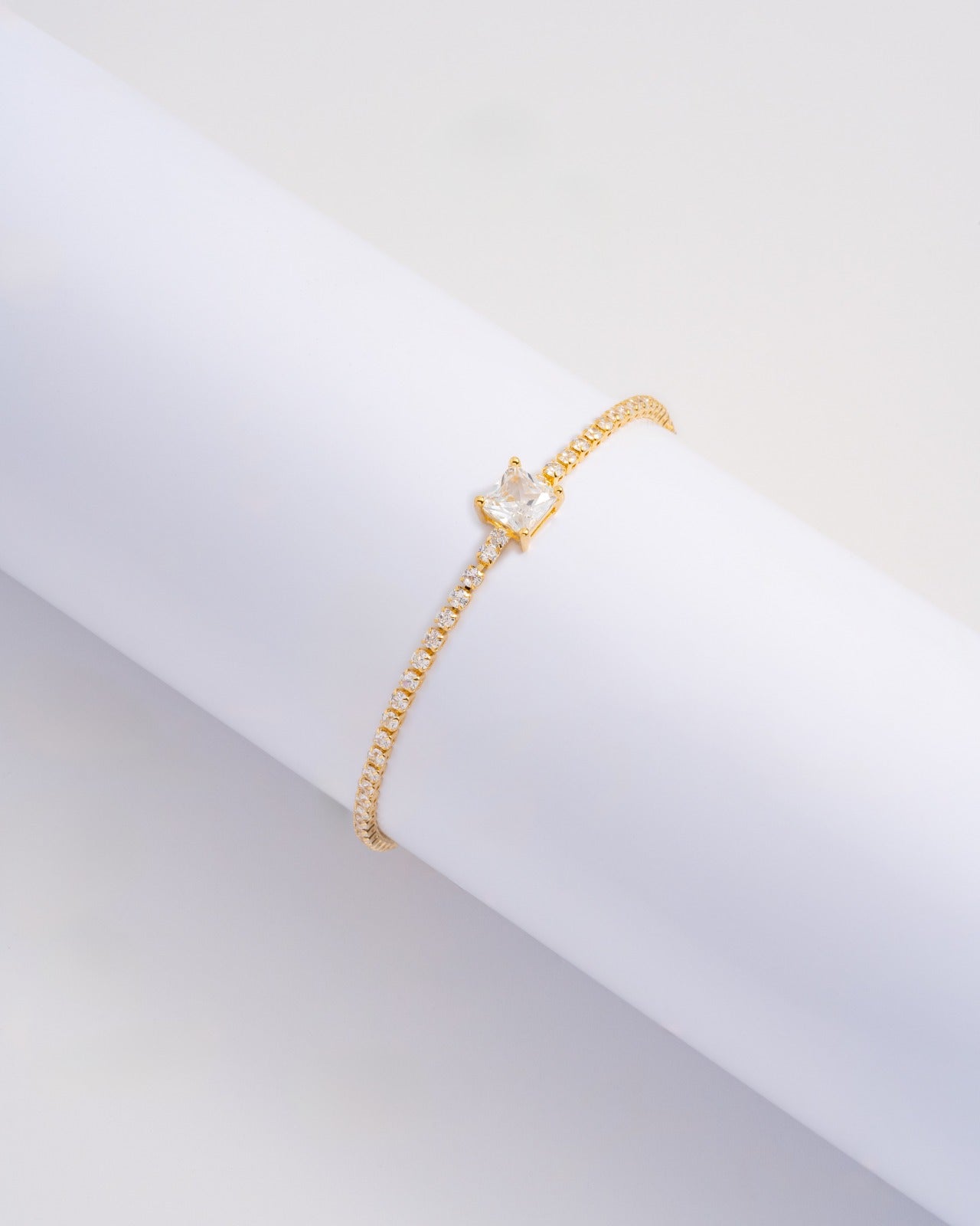 La Pulsera Carré Clair en Oro Laminado 18K combina la delicadeza de una línea tipo tenis con un cristal central corte cuadrado que roba miradas con cada movimiento.