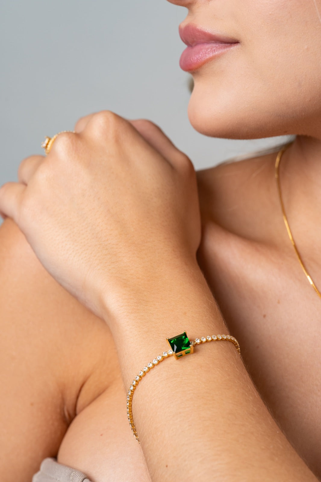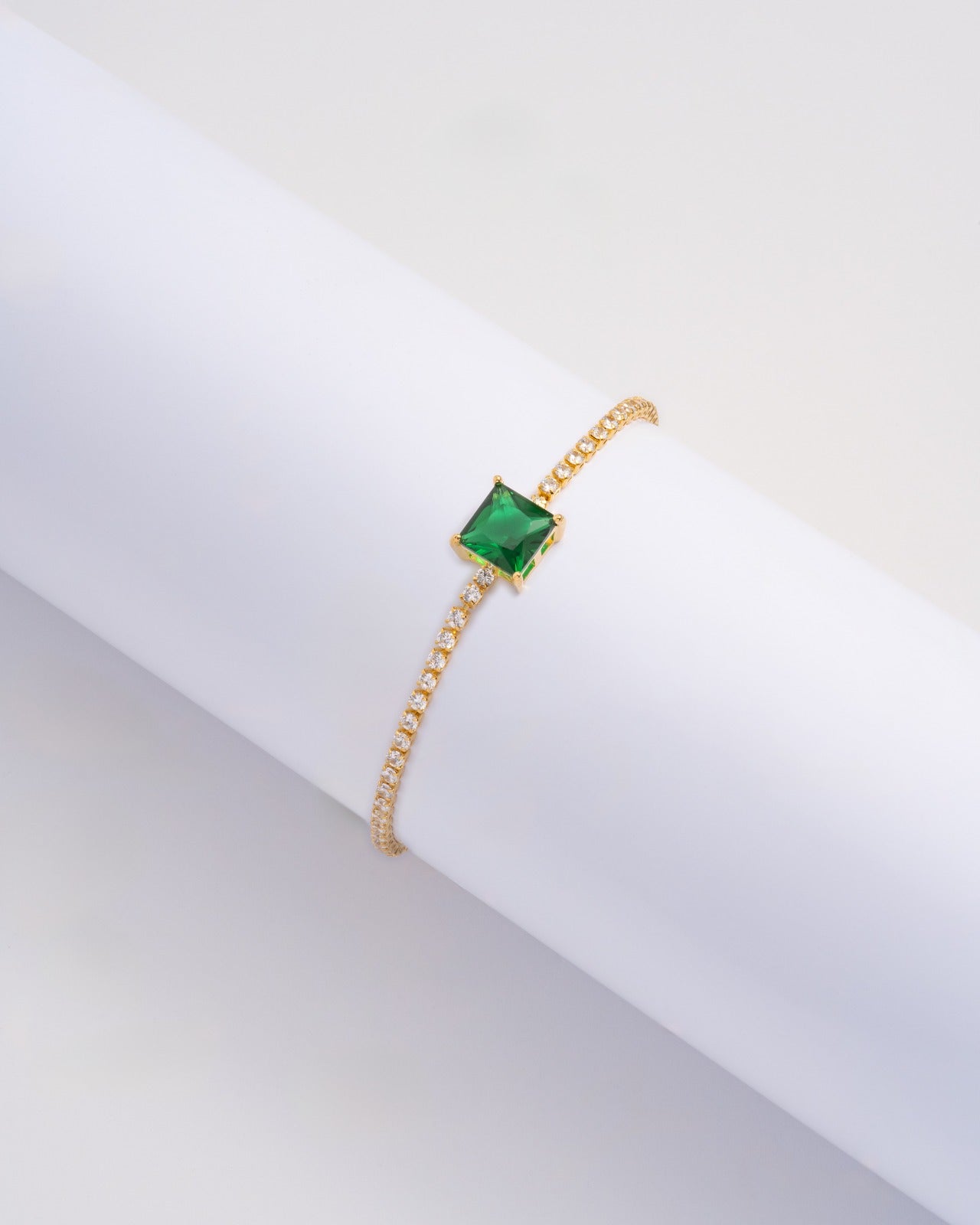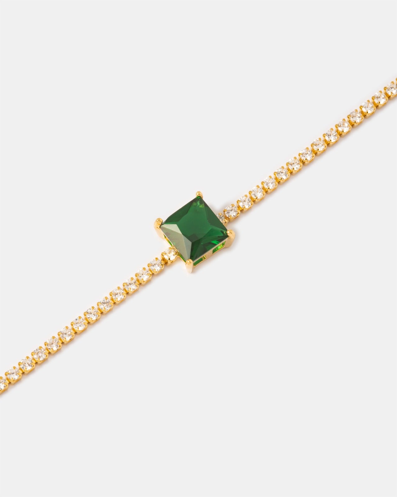 La Pulsera Carré Vert en Oro Laminado 18K combina la elegancia clásica de una línea tipo tenis con la fuerza visual de un cristal central verde corte cuadrado que transmite poder, equilibrio y sofisticación.