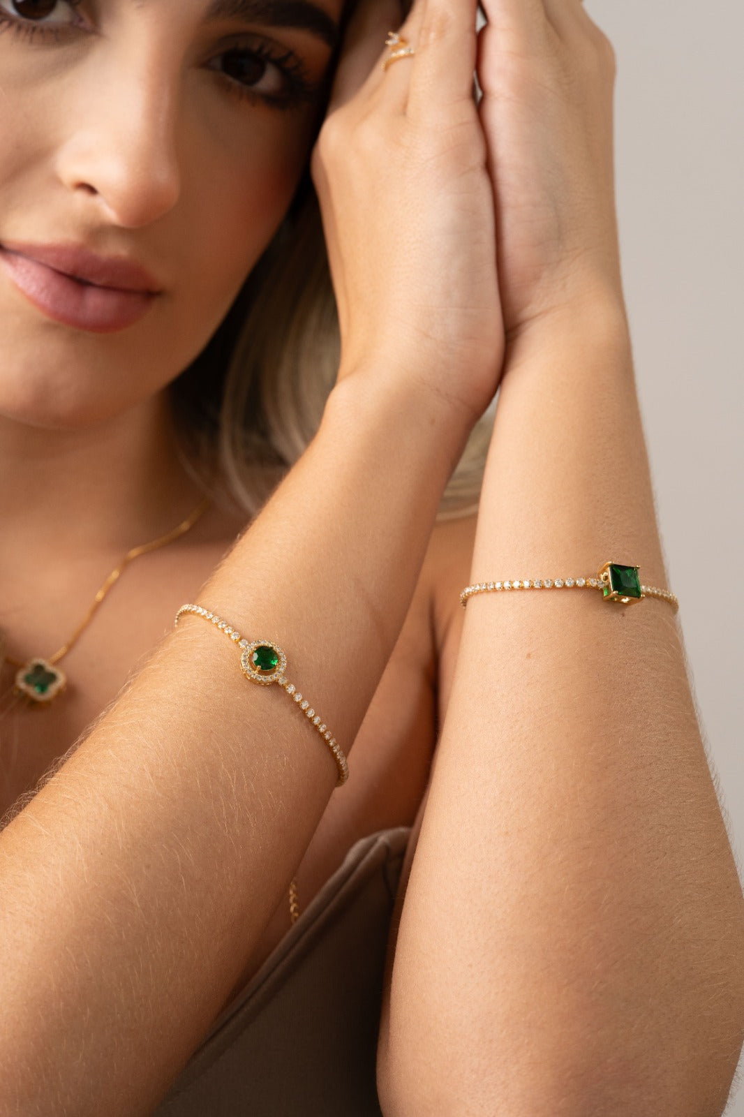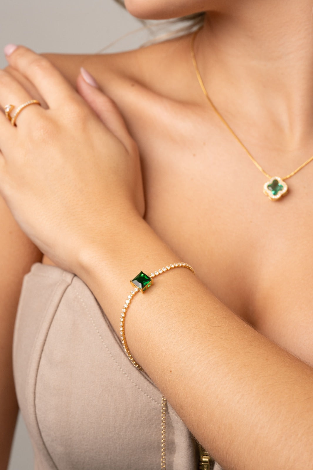 El contraste entre el brillo dorado y la profundidad del verde crea una pieza magnética, perfecta para mujeres que aman destacar con elegancia sin necesidad de exagerar.